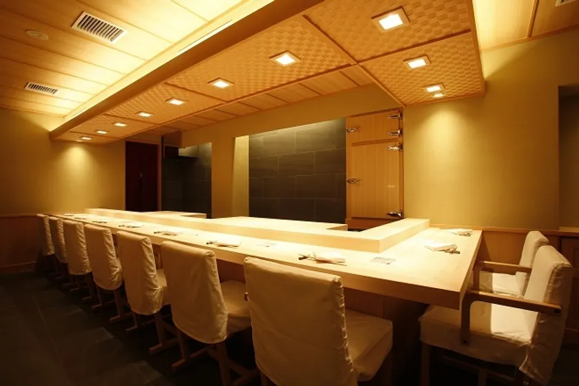 店内に一歩足を踏み入れれば、凛とした檜のカウンターと伝統的な聚楽壁(じゅらくかべ)が静かに風情を彩り数寄屋造りの温かさを感じる空間が広がります。