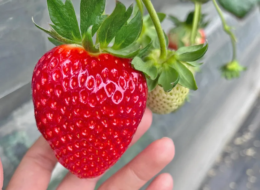 平均糖度12~15度と一般的ないちごより甘い古都華。やさしい酸味もあり、より甘さが際立っています。中には画像のように先端の糖度が20度を超える古都華も存在します!さらに、その味わいを引き立たせているのが味の濃さです。どこを食べても水っぽさのない、濃厚果汁が楽しめます。