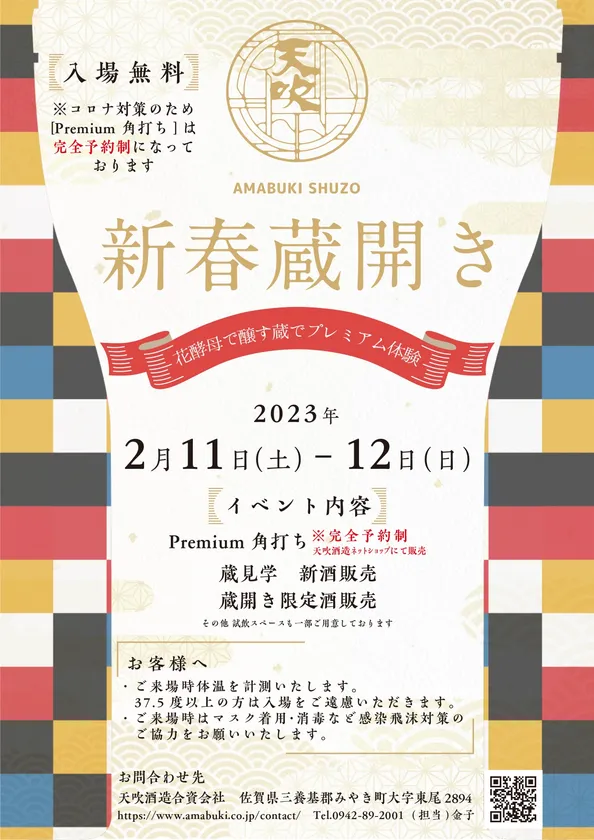 天吹酒造合資会社(佐賀県三養基郡みやき町)は、2023年2月11日(土)~2月12日(日)に、2年ぶりの新春蔵開きを開催します。