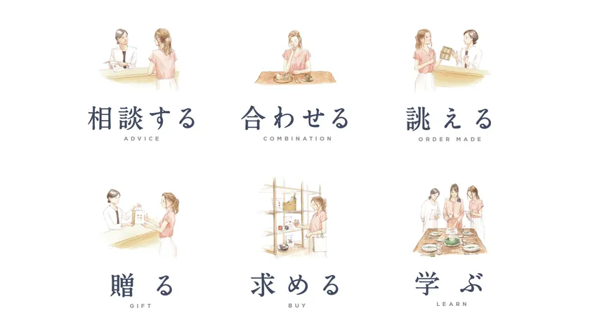 「青山 食演生活」では、おもてなしを愉しむための6つのサービス「相談する」「合わせる」「贈る」「求める」「誂える」「学ぶ」を提供します。一般の方から飲食店オーナー、シェフの方まで利用できます。