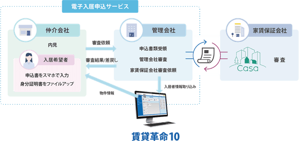 入居申込をオンラインで完結する日本情報クリエイトの「電子入居申込サービス」と株式会社Casaが提携を行うことにより、家賃保証サービスをご利用いただく入居希望者様、仲介会社様、管理会社様はこれまでと比較して、手書きでの保証申込書作成の手間や記載漏れの確認などのストレスが少ない、スムーズな保証審査が可能となります。