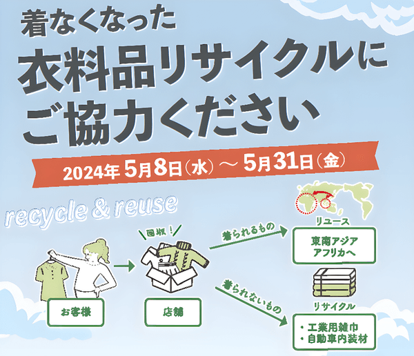 着る機会がなくなった衣料品をリユース・リサイクルで子ども食堂支援へ!「衣料品リサイクルにご協力ください!」5/8(水)~5/31(金)まで、近畿圏15店舗で衣料品回収を実施!