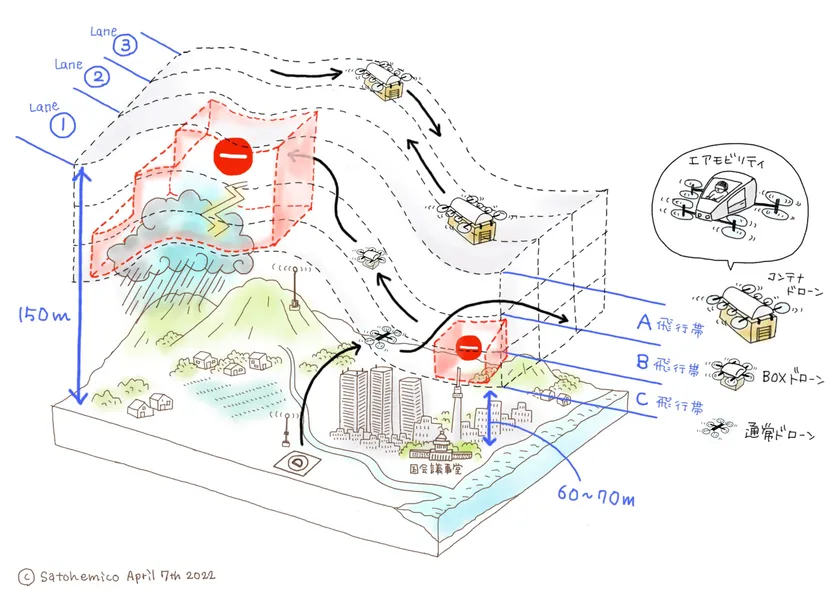 ドローンの自動運航が普及する社会を想定し、エアモビリティが出発地から目的地までの飛行経路を生成し、他の飛行体との衝突を避けスムーズかつ安全な飛行を実現する誘導技術・管理システムを発明し出願しました。