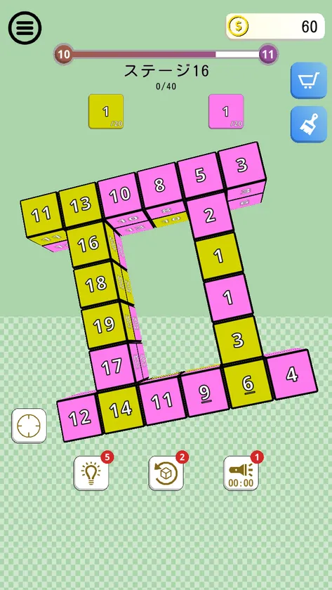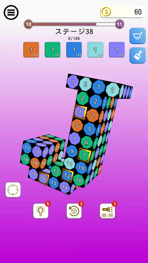 ブロックが見つからなくて困ったとき、あなたをサポートするヒント機能(課金要素あり)が使えます。ハイライト(1つだけ場所を教えてくれる)、ミニマムナンバー(全ての数字が小さくなる)、カラーサーチ(色別で選択して選んだ色のみ見やすくする)が使えます。