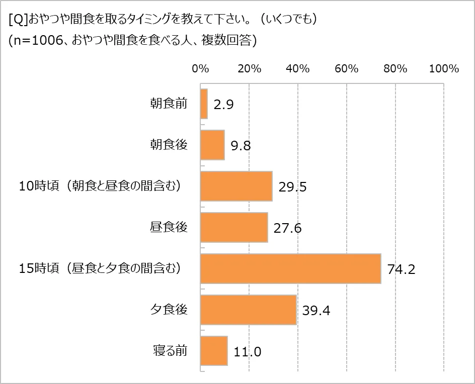 糖質を気にする人が多い一方、ふだんおやつを食べる人は89.8%に上り、ほとんどの人がおやつを食べていることが判明。食べる時間は15時が74.2%でいちばん多いものの、「夕食後」39.4%、「10時ごろ」29.5%も意外に多く、いろんな時間に食べていることがわかります。また、好きなおやつを減らさないために、「プリンやアイスやケーキは減らしたくないので他のものでコントロール♪」(40代・お勉強大好きベロちゃん)や、「砂糖の代わりに、はちみつやデーツシロップを使う。甘みを感じやすいので少量ですむから」(30代・まるやまひとみ)などの調整や工夫をしている人も多くいました。