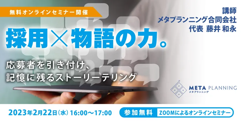 メタプランニング合同会社(本社:愛知県名古屋市、代表社員:藤井 和永)は、無料オンラインセミナー「採用×物語の力。応募者を引き付け記憶に残るストーリーテリング」を2023年2月22日(水)16:00に開催いたします。