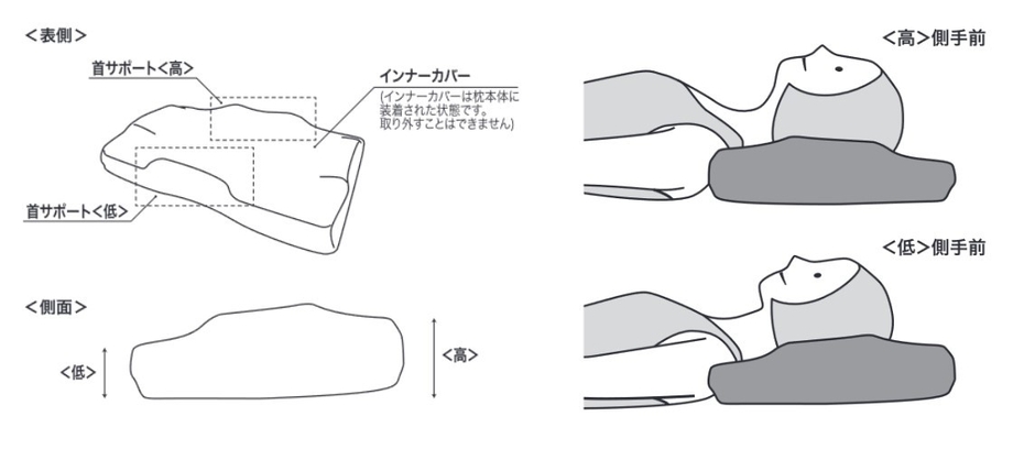 「首サポート」に首を乗せるようにして寝る。好みに合わせて<高>側または<低>側を手前にして使用。
