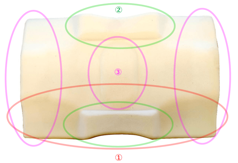 ③頭部から首をやさしく包み込む枕を使うことで首や肩のつらさを防ぐ。