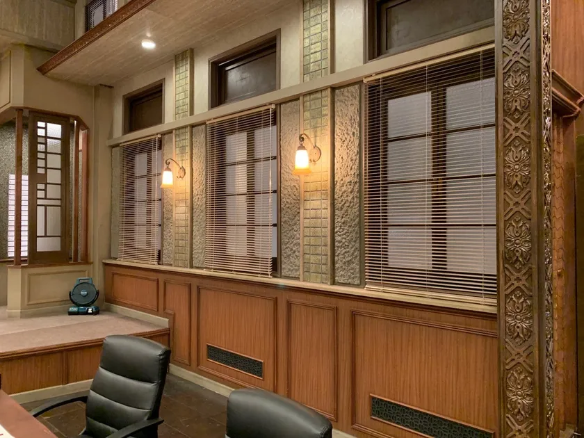 【舞台となる裁判官室のセット】アルミブラインド ベネアル25 TB-849(ライトブラウン)