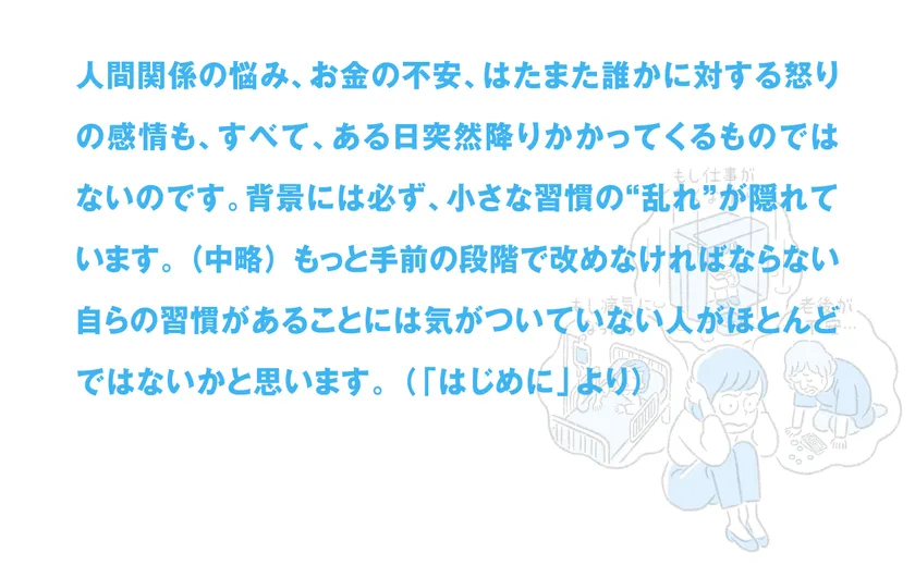 登録者数56万人・総再生数1億回超のチャンネルを持つ、人気YouTube和尚・大愚元勝氏が、誰もがついついやってしまいがちな「不幸まっしぐら」な思考・行動30項目を紹介し、改善策を解説する。数多くの人生相談に応じ、仏教の教えを通じて解決の糸口を見出してきた著者が説き示す「不幸を嘆く前にできること」とは……?今日からできる具体的な実践方法を、ユニークなイラストも交えて、視覚的にわかりやすく伝える。すべての働く世代に「心の処方箋」としておすすめしたい一冊。