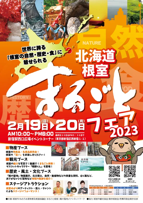 根室市及びねむろ水産物普及推進協議会は、令和5年2月19日(日)~20日(月)の2日間、東京都新宿区の新宿駅西口地下イベントコーナーにおいて『~世界に誇る「根室の自然・歴史・食」に魅せられる~「北海道根室まるごとフェア2023」』を開催します。
