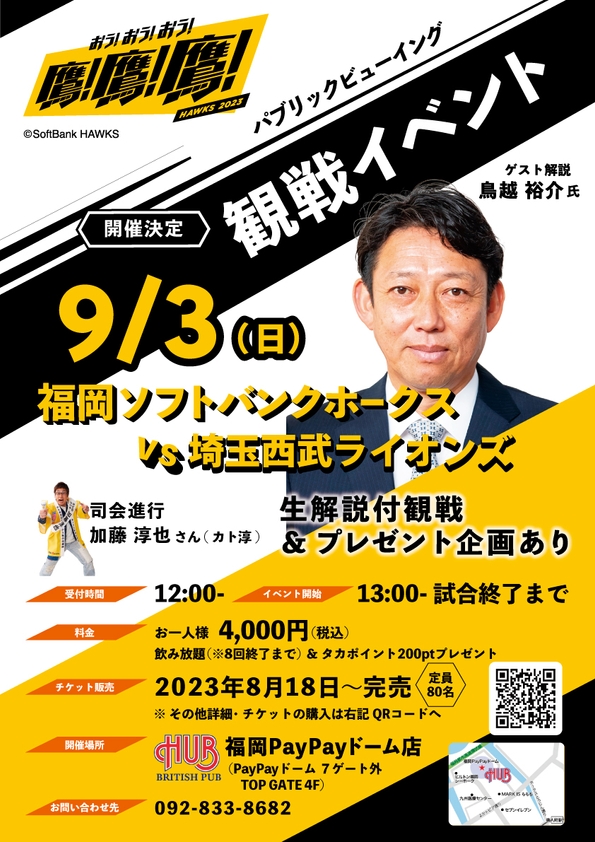 株式会社ハブ(本社:東京都千代田区、代表取締役社長:太田 剛)が運営するHUB福岡PayPayドーム店は、ソフトバンクホークスOB選手による解説イベントを開催いたします。