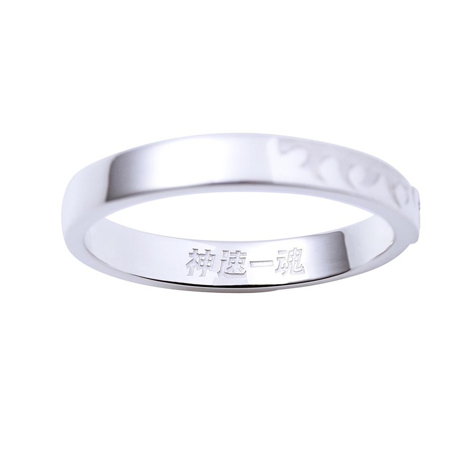 表面には炎柄をデザイン、中央にはユニットカラーストーンをセットし内側にはユニット名を刻印しました。神速一魂の世界観を取り込んだ平打ちフォルムのデザインです。