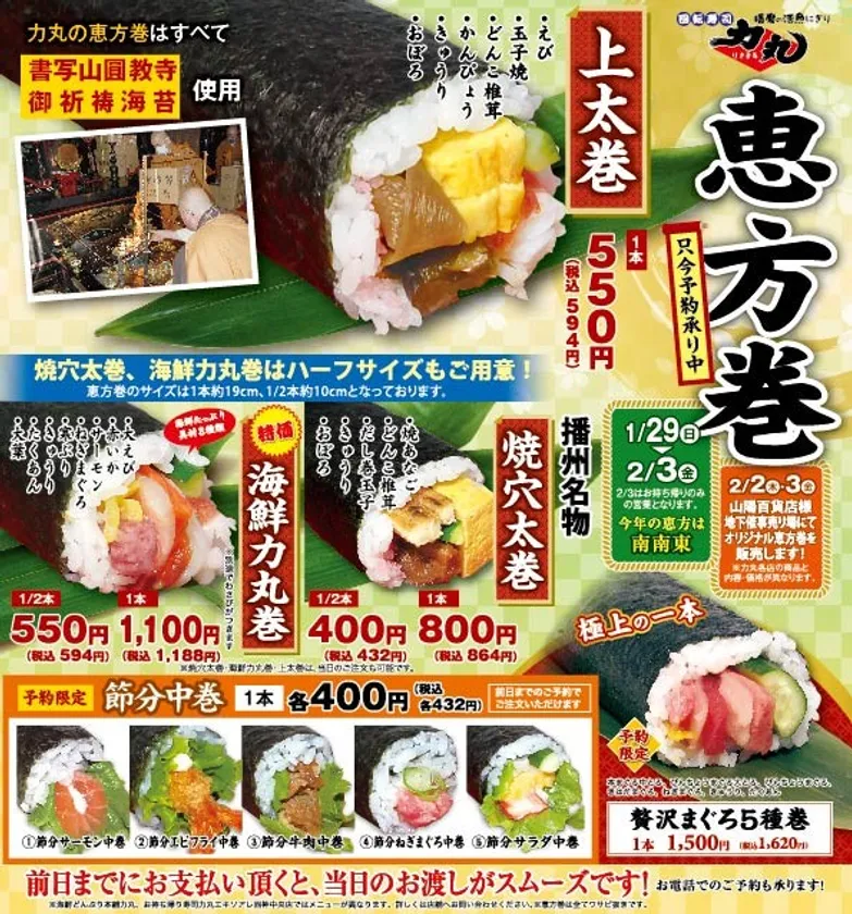 兵庫県姫路市を中心に回転寿司力丸を12店舗、海鮮どんぶり店1店舗、お持ち帰り専門店1店舗を展開する株式会社関西フーズ(代表取締役:福永 力夫)は、回転寿司力丸で「一日でも早く元気な日本へ」と、諸願成就の願いを込めた、特製恵方巻を2023年1月29日~2月3日(山陽百貨店での販売は2月2日~2月3日)の期間限定で販売いたします。販売する全ての恵方巻が書写山円教寺で御祈祷を行った海苔を使用しており、一日でも早くコロナ禍から抜け出し、地域の皆様、そして日本が元気で健やかな一年をお過ごしいただきたいという願いを込めました。
