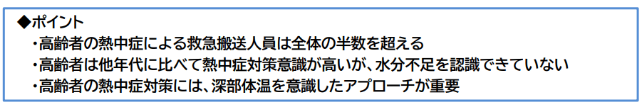 加齢に伴う様々な身体機能の変化によって熱中症のリスクが高い高齢者にとって、水分補給だけでなく身体内部からの冷却や深部体温を意識した熱中症対策のアプローチが重要な対策となり得ます。