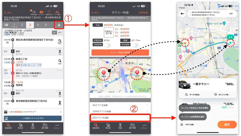 タクシーのみのルートを選択→ 「DiDiアプリを起動」をタップ→ 経路検索結果が引き継がれ、そのまま配車