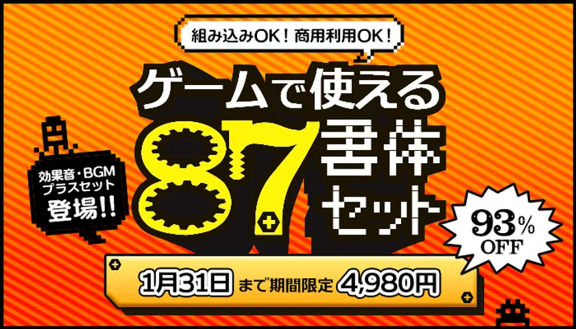 利用者層を絞ったユニークな書体を柔軟な使用許諾かつお求めやすい価格で提供している『fontUcom (フォントユーコム)』の現在販売中のゲームでの組み込みが可能で商用利用も可能な特別商品「ゲームで使える87書体セット」。価格は、通常価格の93%OFFとなる4,980円(税込)。2023年1月31日までの期間限定商品です。