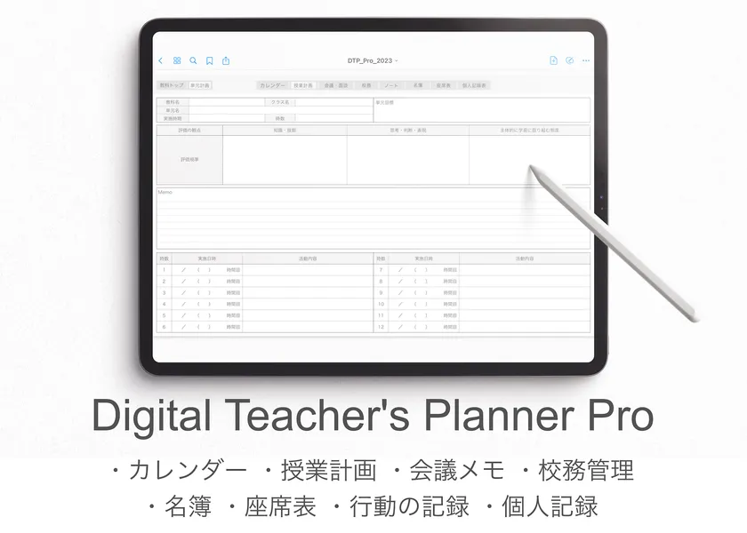 『Digital Teacher's Planner(デジタルティーチャーズプランナー)』は、元教員がデザインしたPDF形式の教師手帳で、iPadの手書きアプリなどに読み込んで使用する製品です。