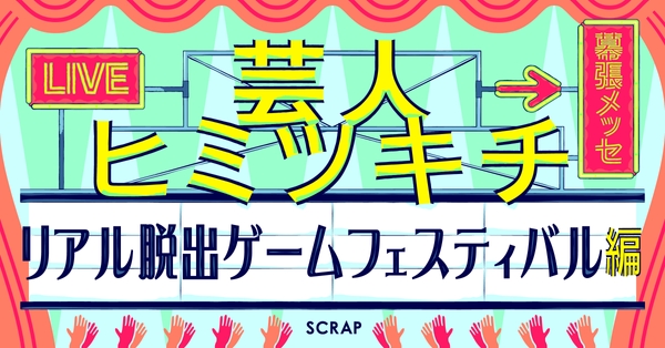 全世界で累計1,300万人以上を動員しているリアル脱出ゲームを企画制作する株式会社SCRAP(本社:東京都渋谷区、代表:加藤隆生)は、幕張メッセ 展示ホール4~7にて8月23日(金)~25日(日)の3日間限定で開催される『リアル脱出ゲームフェスティバル』内のステージコンテンツ『芸人ヒミツキチ〜リアル脱出ゲームフェスティバル編〜』に、人気お笑い芸人「春とヒコーキ」「まんじゅう大帝国」「徳原旅行」「Gパンパンダ」「こたけ正義感」「ファイヤーサンダー」「サツマカワRPG」「どんぐりたけし」「ひつじねいり」「寺田寛明」の出演が決定したことを発表いたします。