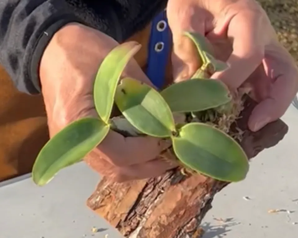 小型の蘭をバークボード(天然の木)に付ける練習をします。