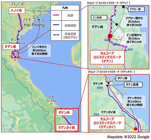 「セムコープ ロジスティクスパーク(クアンガイ)」と「セムコープ ロジスティクスパーク(ゲアン)」は、下図のとおり、それぞれベトナム中部の輸出入拠点であるダナン港・ダナン空港とクアロー港・ビン空港とのアクセスに優れており、広域物流拠点として高い優位性を有しています。このうち「セムコープ ロジスティクスパーク(ゲアン)」は、現在進められているハノイ市・ゲアン省間の高速道路の延伸工事が完了(2024年の予定)すると、ハノイ市とのアクセスが大幅に改善され、物流拠点としての魅力がさらに高まることになります。