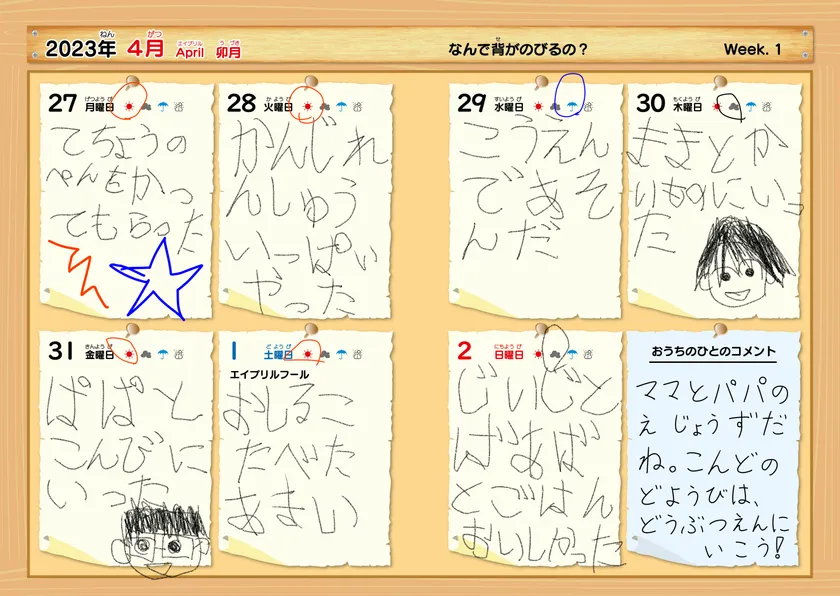 また、おうちの人のコメントが書ける「週間ページ」では、日々を親子で振り返ることで、ほめる行為が自然とできるようになり、こどもの自己肯定感や自己効力感といった非認知能力を育むことができます。