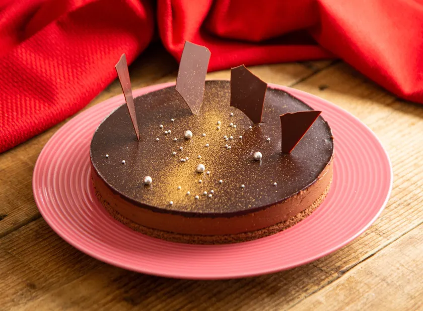 ふんわりと柔らかなスポンジをボトムに敷き、チョコレートで仕上げた濃厚な味わいが魅力のムースを主役に。艶やかなムースのトップには、シルバーのアラザンとカッティングチョコレートが華やぎ、バレンタインならではの特別感をプラスしました。