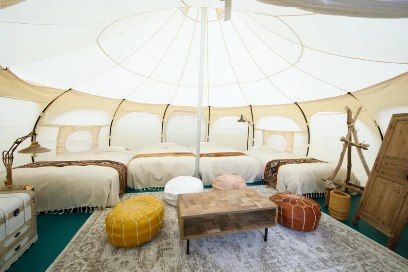 大きな窓が開放的なドームテントで迎える朝。動物たちの鳴き声で目が覚めるかも?