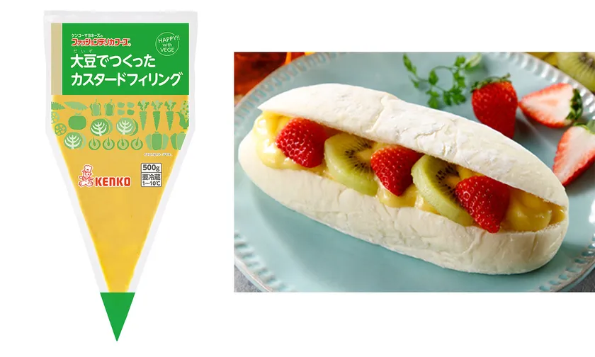 商品名:大豆でつくったカスタードフィリング/メニュー名:大豆でつくったカスタードフィリングとフルーツの米粉こっぺ