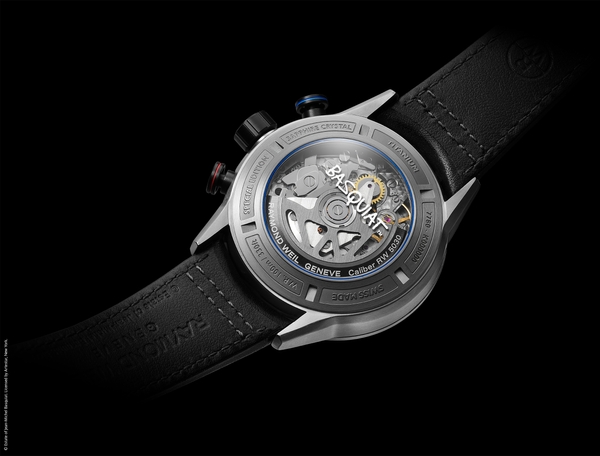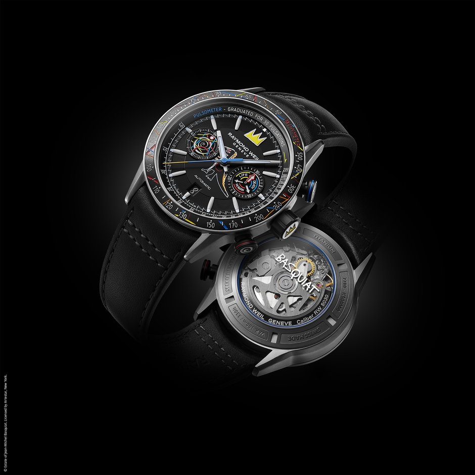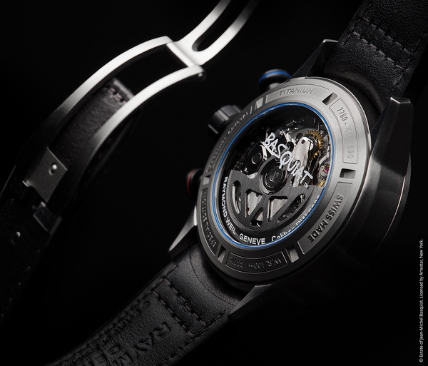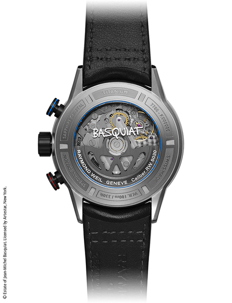 チタンカラーのPVDコーティングを施したステンレススティール製ケースバック。中心にはバスキアのシグネチャーが描かれ、ローターはレイモンド・ウェイルのイニシャルを象ったW字型に設計。ブルーのガスケットがアクセントとなり、バスキアとレイモンド・ウェイルの調和を引き立てています。