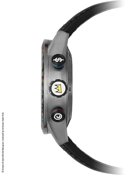 ブラックを基調としつつ、差し色にレッド・ブルー・イエローの原色を用いたカラーリング。中央には、バスキアが1984年に描いた、バスキアのシンボルマークである王冠を被った恐竜“Pez Dispenser”をデザイン。12時位置の王冠マークにはイエロースーパールミノバ、ニッケルメッキのアプライドインデックス・時針・分針にはホワイトスーパールミノバを施し、暗所での視認性も確保しています。