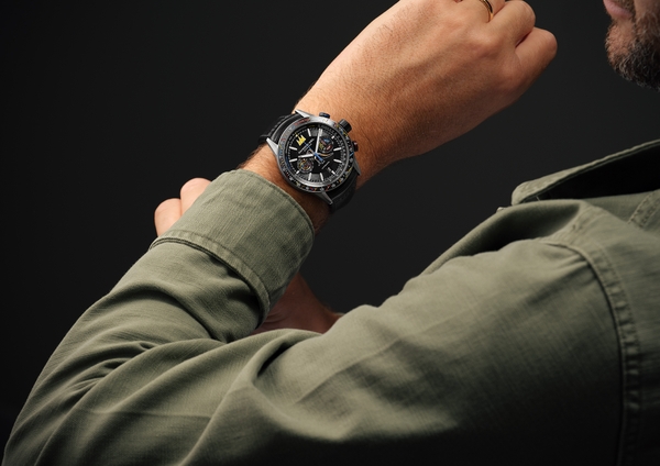 ステンレススティールに比べて、軽量かつマットな色味が特徴のチタン製ケース。ねじ込み式リューズに王冠マーク、プッシュボタンにドルマーク(2時位置)と著作権マーク(4時位置)をデザイン。セラミック製ベゼルにはタキメーター、インナーベゼルには30回の心拍にかかった時間から1分あたりの心拍数を測定できるパルスメーターが搭載されています。