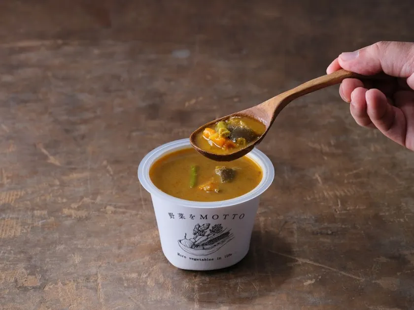 この度、「ベジMOTTO」内でも人気が高いカレーシリーズ第3弾として、「緑黄色野菜たっぷりまろやかスパイシースープカレー」が新登場。国産のかぼちゃ、なす、インゲン、ピーマンなどをたっぷり使用し、ゴロっとした具材は食べ応え抜群。動物性のエキスを使用せずオニオンソテーとマンゴーピューレを使用し、野菜のうま味をじっくりと引き出したカレーは、マイルドな辛さが食欲をそそる商品となっています。