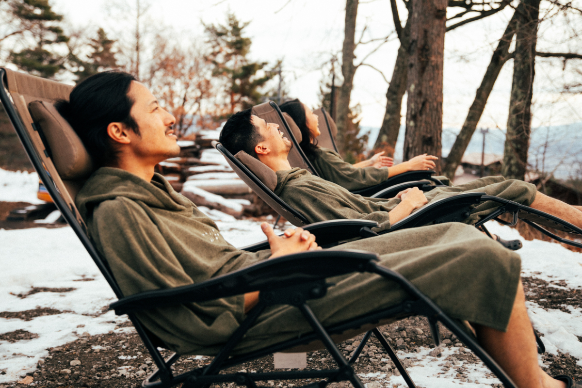 湧水の水風呂と森の中の整いスペースで自然に還るように体を癒す。