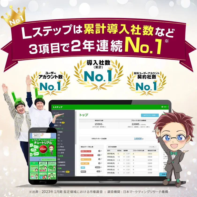 「Lステップ」がLINE公式アカウントを用いた マーケティングツールの実績調査にて 「導入社数(累計)」など3項目で2年連続No.1を獲得