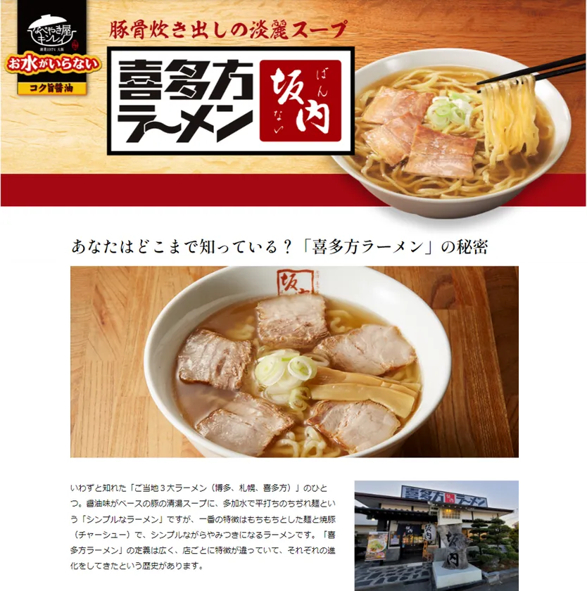 ・「お水がいらない 喜多方ラーメン坂内」の開発秘話や麺・具材・スープのこだわりを紹介している特設サイトをオープンしました。札幌味噌ラーメン、博多豚骨ラーメンと並びご当地三大ラーメン※に数えられる喜多方ラーメンの特長についても紹介しています。(※引用元:ラーメンデータベース公式HP)