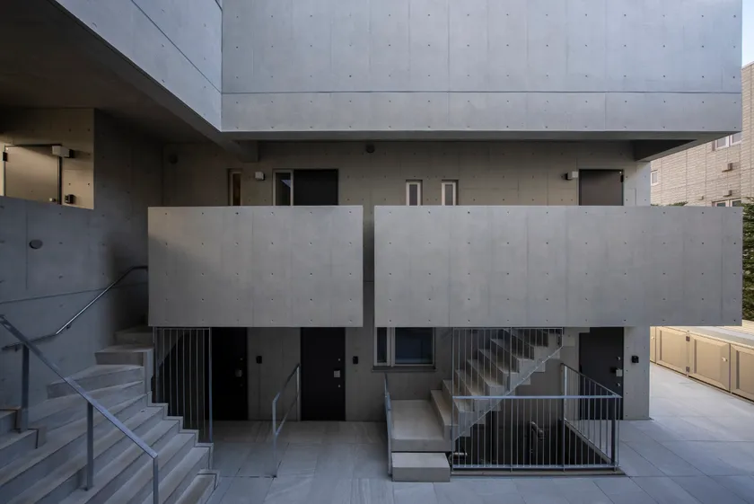を可能にしました。全住戸の玄関が面する中庭は自然なコミュニケーションが促されるような構成とし、奥にはステージ状の大階段を設けています。