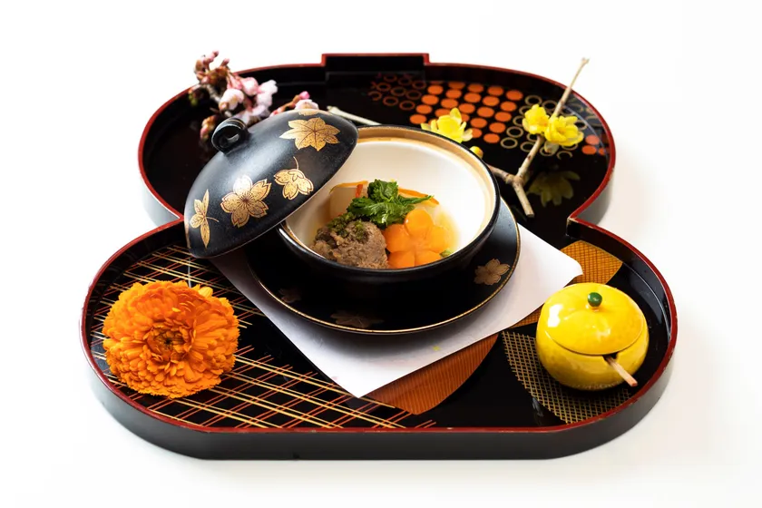 [メニュー名]ジビエつくねと季節の野菜の炊き合わせ 自家製柚子胡椒を添えて