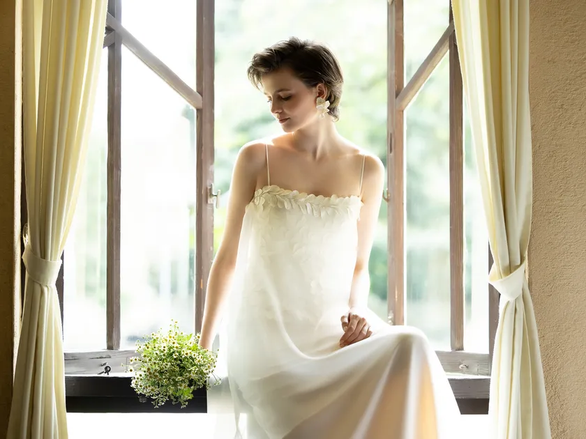 今回のデザインを手掛けるのは、「The COTTIE LOU Design株式会社」代表 立浪ロウ氏。ウエディングドレスは幸せの象徴、企画の段階からテーマとして据えていたのは「Smile」だと彼女は言います。シンプルで笑顔の引き立つデザインであることをベースに、インポート素材やサスティナブルなイタリアの新素材を取り入れ、ハイファッションとしてのドレス、という点が意識された仕上がりとなりました。