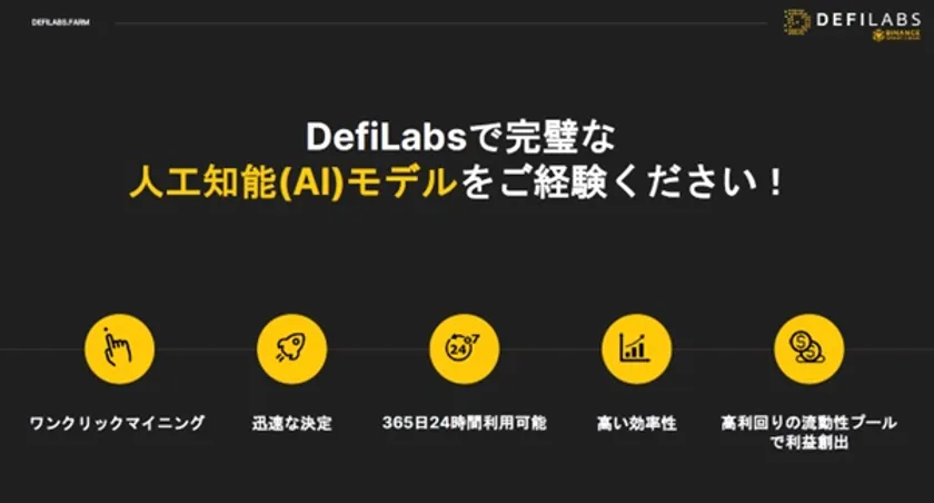 「AIによる年利回り最大期待値が186.70%あり、人の手を介さずに高い利回りを期待できる」「国際情勢による影響を受けにくく、単一通貨における資産運用より変動損失を防ぎやすい」といった魅力を兼ね備え、海外の多くのメディアから注目を集め、どなたでも簡単に自動で資産を増すことのできるDefiLabsは、アジア太平洋地域で急速に拡大していますが、まだ日本では知られていない最先端の投資法です。