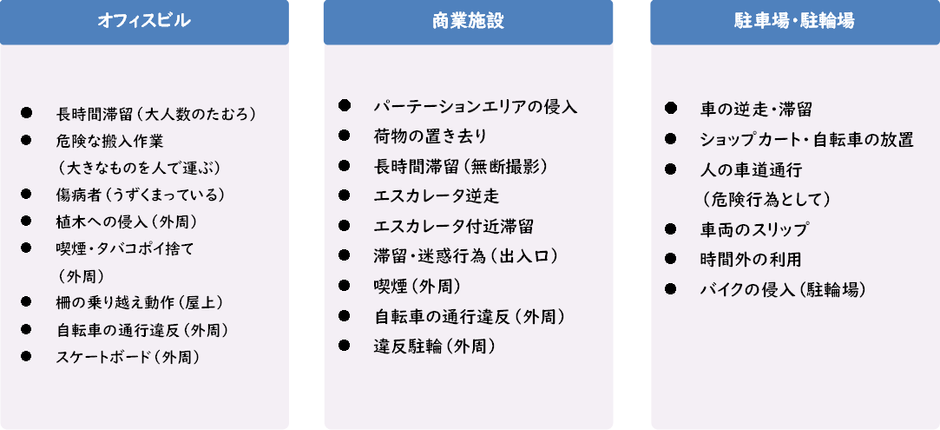 1. 検知する対象が人やモノではなく画素の集合で検知するため、火災、侵入、逆走、転倒、集団など、様々な場面に対応可能