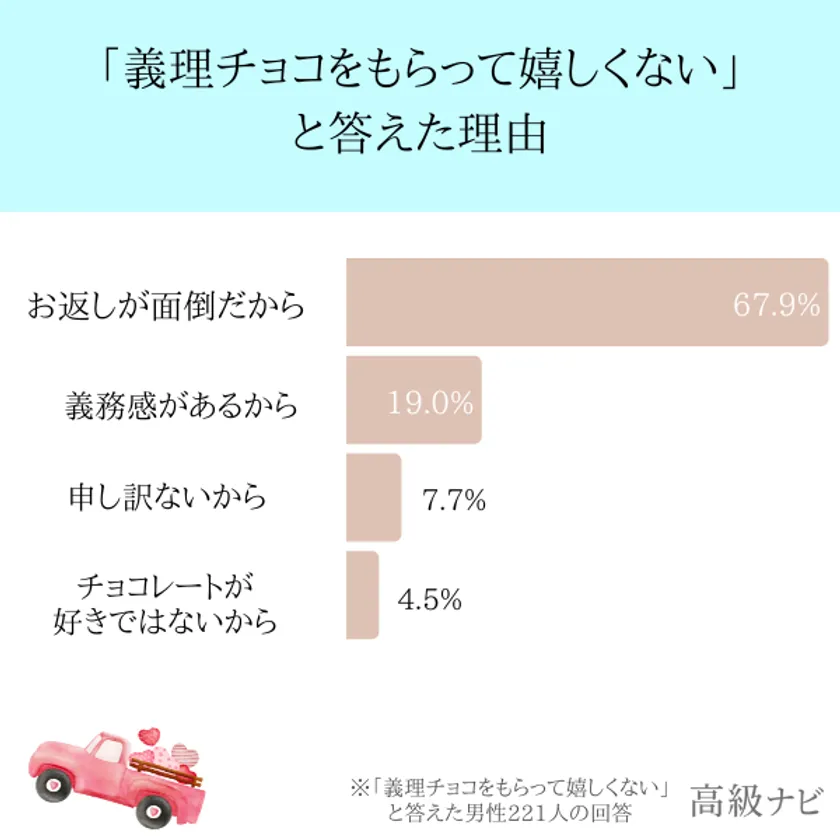 反対に、「義理チョコをもらって嬉しくない」と感じる理由は、「お返しが面倒だから」というものが最も多かったです。