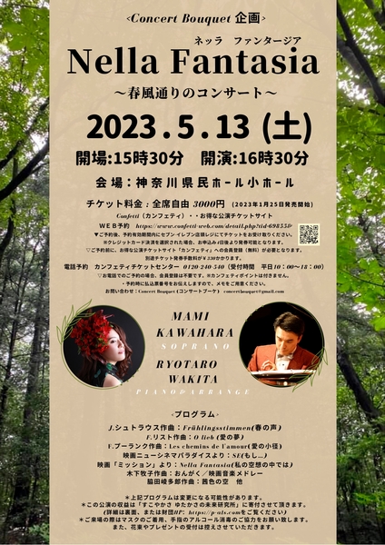 Concert Bouquet企画『Nella Fantasia~春風通りのコンサート~』が2023年5月13日 (土)に神奈川県民ホール 小ホール(神奈川県横浜市中区山下町3-1)にて開催されます。本公演は、ALS患者と家族を支える 一般財団法人「すこやかさ ゆたかさの未来研究所」に収益が寄付されるチャリティコンサートです。