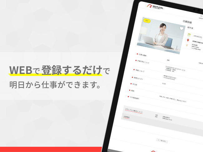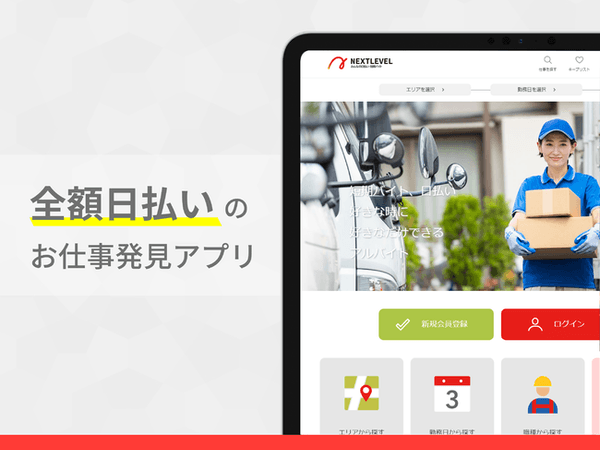 『ネクストレベル』とは、すぐにお仕事がしたい、今週中にお金が必要、明日の空き時間に仕事がしたい! そのようなワーカーと企業様の繁忙期のお仕事をマッチングする為の全額日払いアプリです。