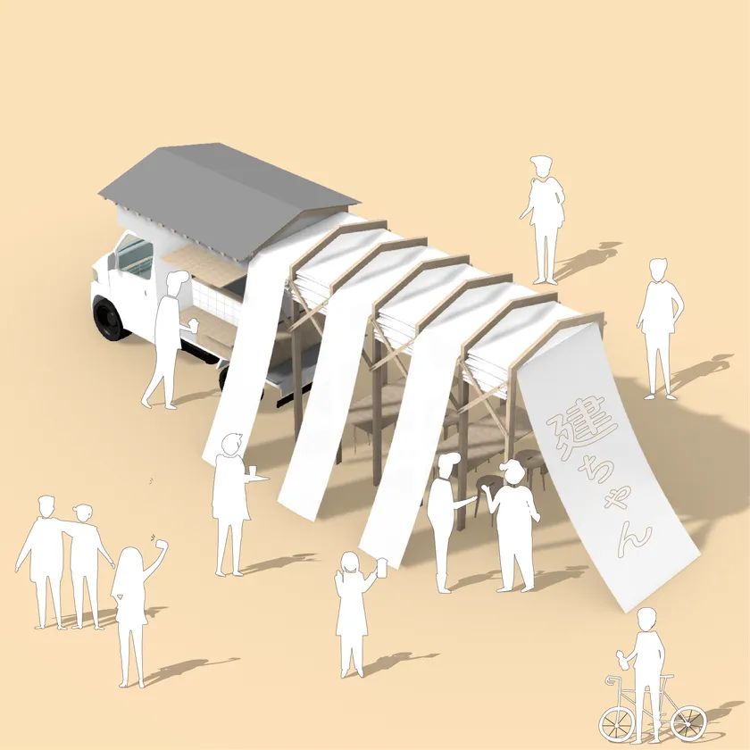 最優秀賞に選ばれたのは、「Expansion Yatai ~伸縮する屋台~」。糸島市の自然を楽しみながら、場所や用途に合わせて展開できる屋台です。移動販売車製作会社「株式会社オオカミ堂(代表取締役:堂森 英雄氏)」協力のもと、学生が試行錯誤を重ねながらデザイン案を形にしました。