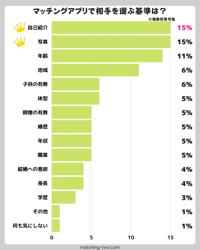 ・マッチングアプリのお相手選びは、「自己紹介文」「写真」を重視している人が多く、内面・外見が変わるプロフィール作りが大切であることが分かりました。