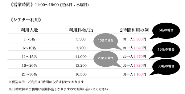 2時間33,000円でレンタルしていたプライベートシアターを、少人数でも使いやすい料金にリニュアール。人数制になったことで、人数が増えるほど割り勘でお安くなります。