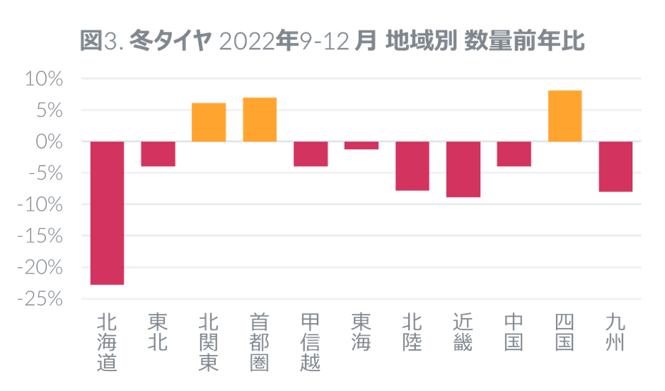 2022年9-12月の冬タイヤ販売は数量前年比3.8%増であったが、店頭販売では同4.3%減と前年を下回った。降雪地域の販売状況をみると、北海道では数量前年比22.8%減と大きく落ち込み、東北では同4.0%減、北陸では7.8%減であった(図3)。