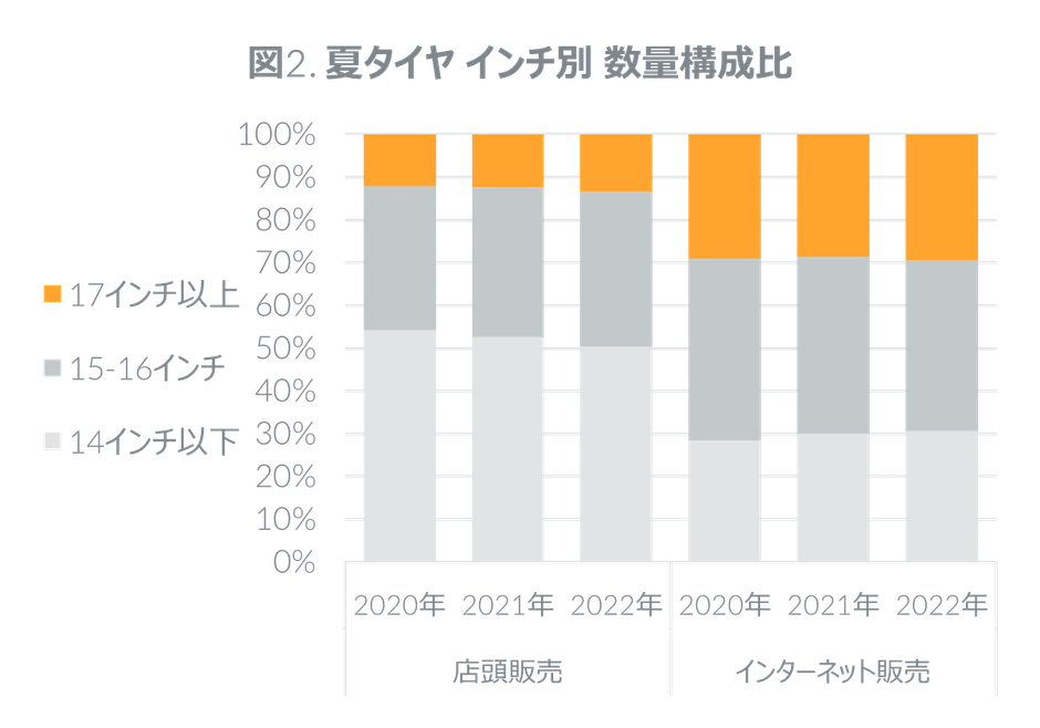 夏タイヤでは大きいサイズへの需要が徐々に高まっており、これも価格上昇の一因と考えることができる。17インチ以上の数量構成比をみると、店頭販売では前年の12.4%から13.3%に、インターネット販売では28.7%から29.4%に拡大した(図2)。金額構成比では、店頭販売では30.2%、インターネット販売では52.9%に至った。なお17インチ以上での販売上位3サイズは、店頭販売では215/55/17、215/45/17、225/45/18、インターネット販売では225/45/18、215/55/17、215/45/17であった。