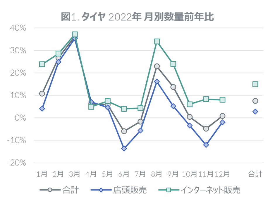 2022年の国内タイヤ市場は数量前年比7.5%増と堅調で、店頭販売では同2.7%増と微増であったが、インターネット販売では同14.9%増と好調であった(図1)。